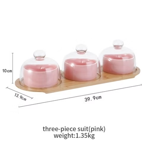 Snack serving tray, ceramic dip bowls, dessert bowl with glass dome, Wooden coast