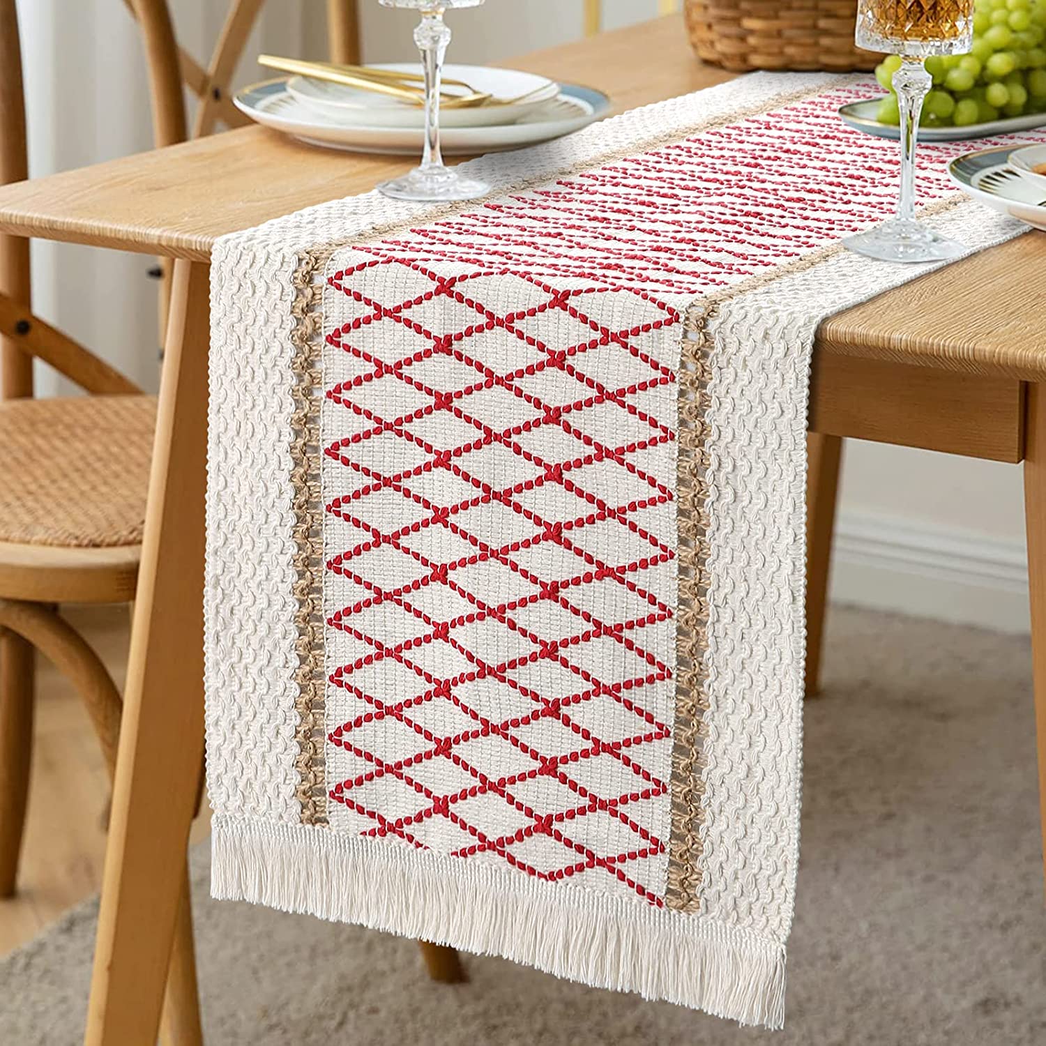Cream & Red Textured Table Runner – Boho Woven Design with Fringe