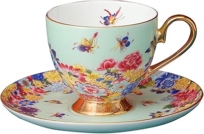 Green Floral Porcelain Teacup and Saucer Set with Gold Handle – Vintage Style